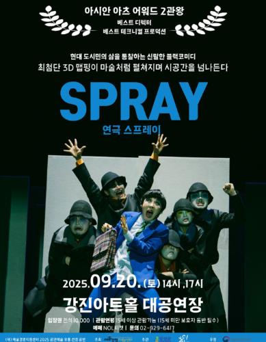 ‘스프레이’는 3D 디지털 매핑과 움직이는 무대연출, 역동적인 연기로 영국 에딘버러 페스티벌에서 베스트 디렉터상, 베스트 테크니컬 프로덕션상 등 2관왕을 거머쥔, 2025년 가장 기대되는 강진아트홀 공연으로 기대를 모으고 있는 작품이다.