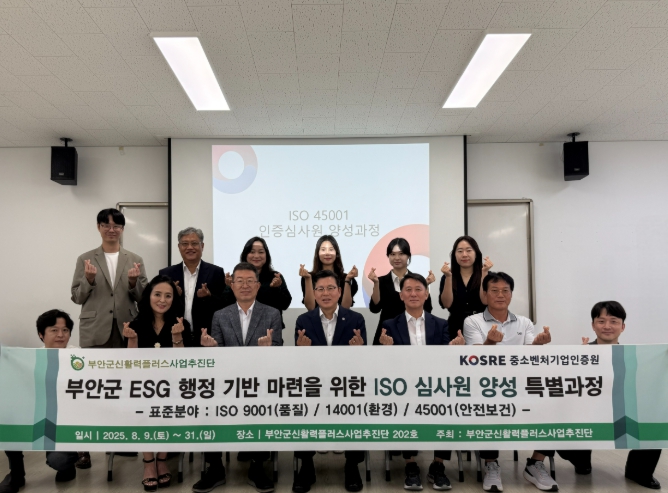 추진단 정우중 사무국장은 “중소벤처기업인증원의 전문 강사진이 직접 참여한 만큼, 부안군 실정에 맞는 ISO 전문 인재들이 양성될 수 있었다”며, “앞으로도 ESG 행정 선도도시 부안군에 걸맞은 지역사회와 기업이 함께 성장할 수 있도록 전문 인력 양성, 교육·훈련 지원, ESG 연계 사업 등을 지속적으로 추진해 나갈 계획”이라고 말했다.