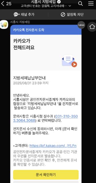 ![]() 모바일(카카오톡) 전자문서로 발송된 '지방세체납납부안내' 화면 |