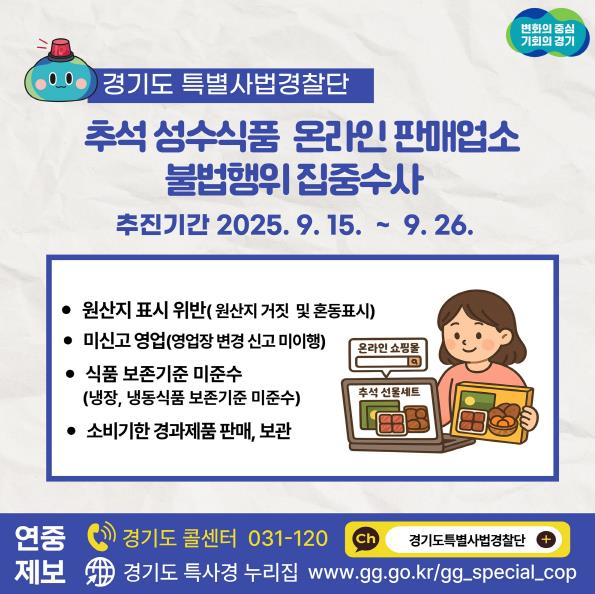 이번 수사는 비대면 소비문화 확산으로 온라인을 통한 제수 용품·추석 선물 세트 구매가 증가하는 현실을 반영해 도민이 믿고 먹을 수 있는 안전한 먹거리 확보를 위한 선제적 조치다.