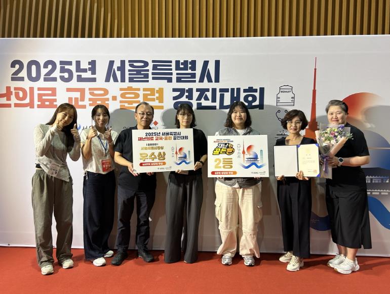 ![]() 2025년 서울시 재난의료 교육‧훈련 경진대회에서 강북구보건소 직원들이 우수상을 수상한 후 기념촬영을 하고 있다. |