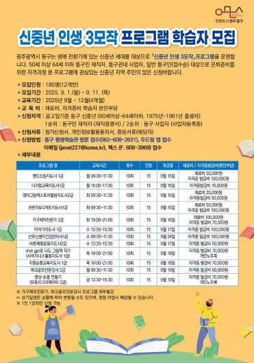 임택 동구청장은 “은퇴가 두려움이 아닌 새로운 인생 전환의 발판이 되길 기대하며, 신중년이 가진 풍부한 경험과 지혜가 동구 지역 곳곳에서 발휘될 수 있도록 적극 지원하겠다”고 말했다.