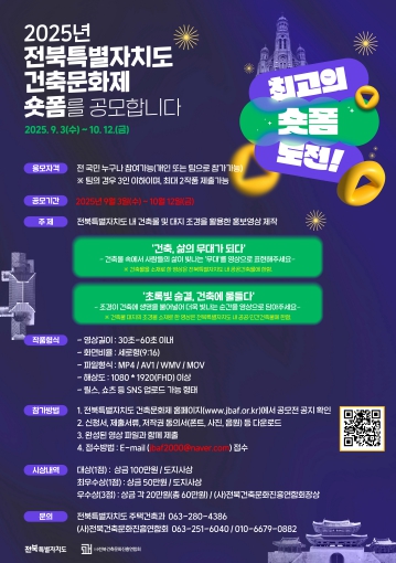 ![]() 제26회 전북특별자치도 건축문화제, 전북의 ‘美’를 숏폼에 담다! |