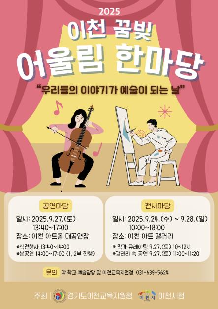 경기도이천교육지원청 김은정 교육장은 “이번 어울림 한마당은 학생과 지역사회가 함께 만들어가는 문화예술 축제”라며, “지역민 모두가 예술을 통해 소통하고 공감하는 뜻깊은 시간이 되기를 기대한다”고 말했다.