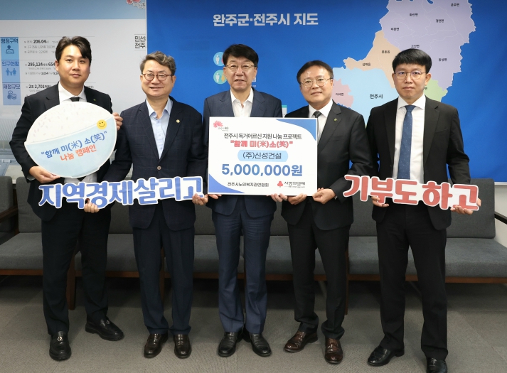 전주시와 ㈜신성건설은 2일 전주시장실에서 우범기 전주시장과 이용호 신성건설 대표이사, 이강영 전무이사, 최재훈 전주시노인복지관연합회장 등이 참석한 가운데 전주지역 독거노인 지원을 위한 나눔 프로젝트인 ‘전주함께미(米)소(笑)’ 기부금 전달식을 가졌다.