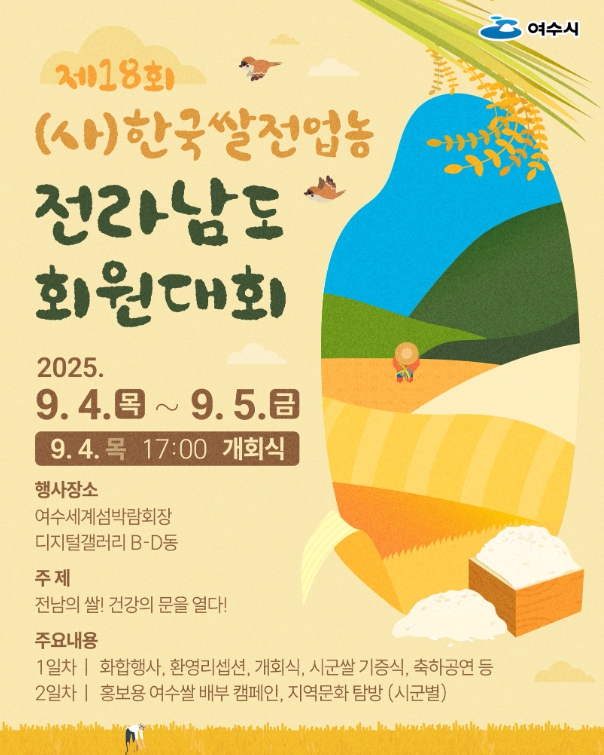 첫날인 4일에는 회원 화합 한마당, 개회식, 축하공연 등이 진행되며, 둘째 날에는 여수 쌀 홍보 캠페인과 여수지역 문화탐방 등 다양한 행사가 마련된다.