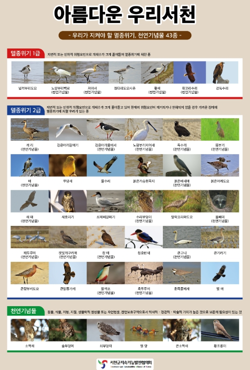 이번 포스터는 서천지속협 기후생태환경분과 전홍태 위원이 10년 넘게 서천군 전역에 분포하는 법적 보호종과 다양한 조류의 생태적 가치를 알리고자 촬영한 자료를 정리한 포스터이다.