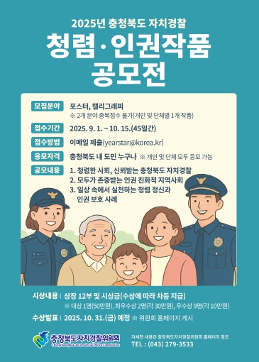 ![]() 충북자치경찰위원회, ‘2025년 청렴・인권작품 공모전’ 포스터 |
