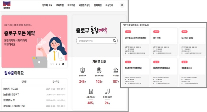 이로써 구민들은 구청 누리집 내 ‘통합예약’ 페이지에 접속해 정보화교육, 종로교육포털, 자치회관, 시설관리공단, 문화재단 등에서 운영하는 프로그램을 시간과 장소에 구애받지 않고 빠르게 확인하고 신청할 수 있다.