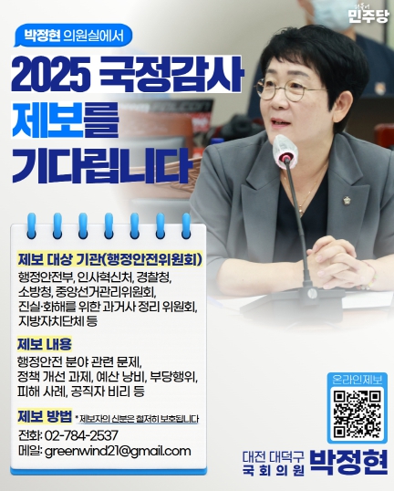 박정현 의원은 “이번 2025년 국정감사를 통해 시민 불편을 해소하고 불합리한 제도를 개선하기 위해 최선을 다할 것”이라고 말했다.