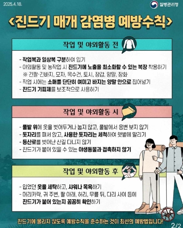 보건소 관계자는 “9월부터는 진드기 유충이 왕성하게 활동하는 시기로, 야외활동 시 진드기 기피제 사용, 피부 노출 최소화, 귀가 즉시 샤워 등 예방수칙 준수가 필요하다”며, “시민들의 진드기 매개 감염병 예방을 위해 교육 및 홍보를 지속적으로 진행할 계획”이라고 밝혔다.