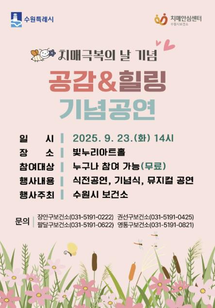 수원시 관계자는 “수원시 4개 구 보건소가 공동 주관한 이번 공연은 치매에 대한 인식을 개선하고 치매환자와 가족, 지역사회가 함께 소통할 수 있는 행사”라며 “많은 시민이 함께해 주시길 바란다”고 말했다.