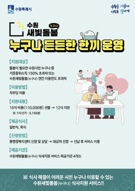 ![]() 수원새빛돌봄(누구나) 식사지원서비스 ‘누구나 든든한 한끼’ 홍보물 |
