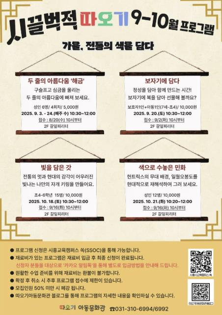 따오기아동문화관 관계자는 “최근 ‘케데헌’을 계기로 전통문화에 관한 관심이 높아진 만큼, 이번 가을 프로그램이 아이들과 가족 모두가 우리 문화의 가치를 체감하는 소중한 기회가 되길 바란다”라고 말했다.