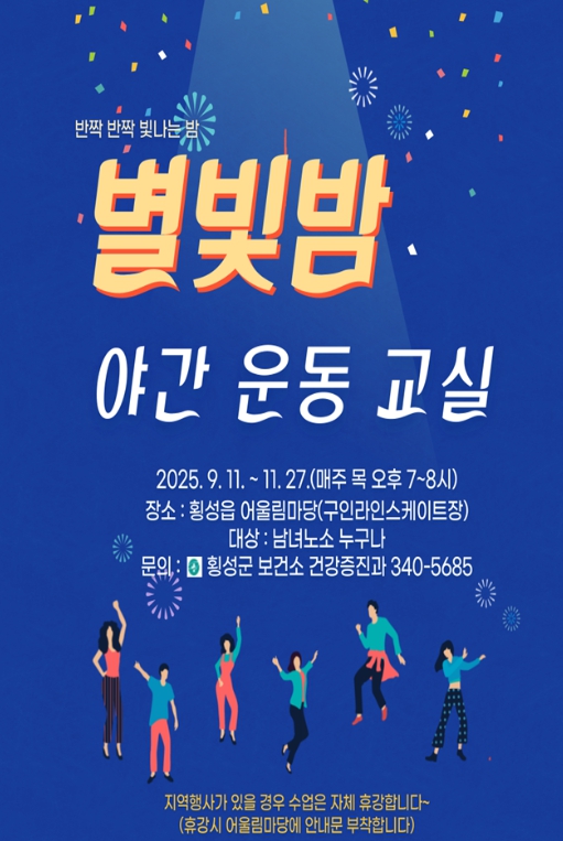 이번 교실은 오는 11일부터 11월 27일까지 매주 목요일 저녁 7시부터 8시까지 횡성읍 어울림마당(구 인라인스케이트장)에서 열린다.