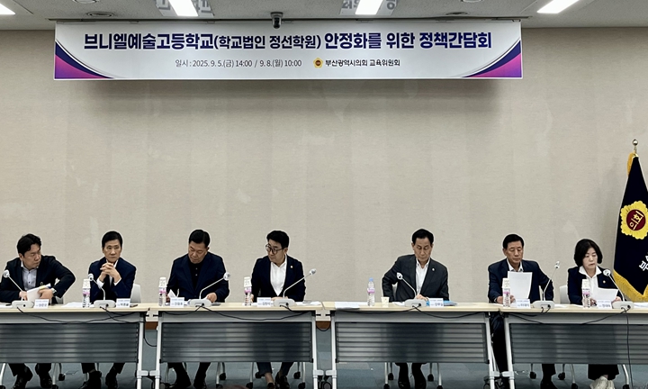 정책간담회에는 교육위원회 위원 7명을 비롯해 브니엘예술고등학교 관계자(학교장, 교사·학부모 대표 등), 법인 설립자, 부산시교육청 관계자 등 총 24여 명이 참석했다.
