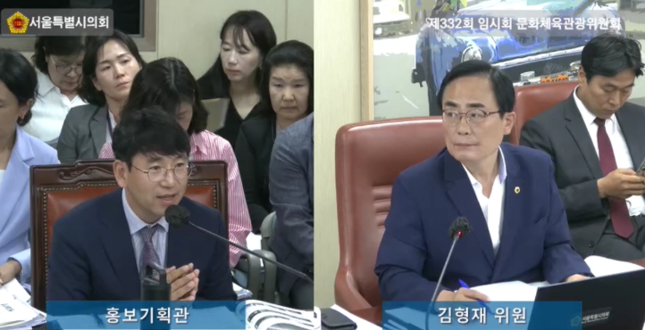 ![]() 김형재 의원이 1일 개최된 제332회 임시회 서울시의회 문화체육관광위원회 회의에서 서울시 홍보기획관에게 질의를 하고 있다. |