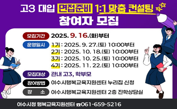 ![]() 여수시, 2026 대입 면접준비 1대1 맞춤 컨설팅 운영 |