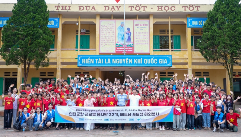 ![]() 인천국제공항공사는 인천공항 상주직원으로 구성된 합동 봉사단이 지난 8일부터 13일까지 베트남 푸토성에서 해외봉사활동을 진행했다고 밝혔다. 사진은 인천국제공항공사 신가균 경영본부장(사진 앞줄 가운데)을 포함한 봉사단원들이 베트남 현지 중학교에서 한국문화 교육활동을 진행한 후 학생 및 관계자들과 기념촬영을 하고 있는 모습. |