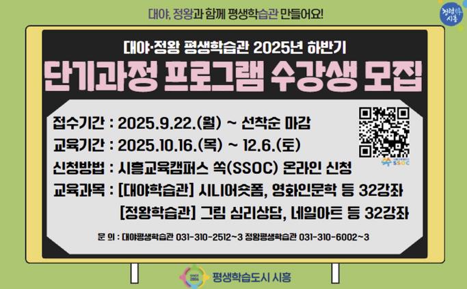 ![]() 시흥시 대야·정왕평생학습관, 하반기 단기과정 평생학습 프로그램 수강생 모집 |