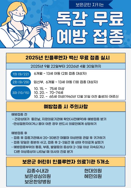 ![]() 보은군보건소, 어린이 독감 접종으로 우리 아이들의 건강을 지켜주세요! |