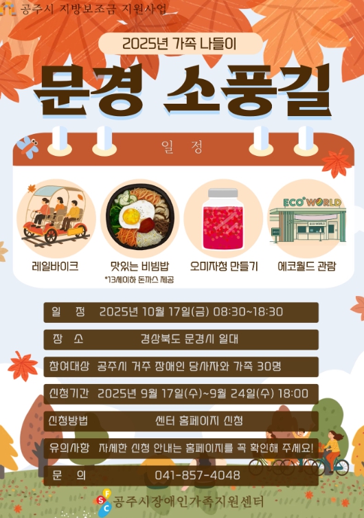 프로그램 참여 신청은 9월 24일까지 공주시장애인가족지원센터 누리집에서 온라인으로 가능하다.