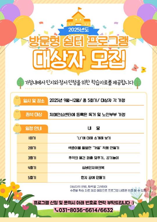 김태숙 오산시 보건소장은 “외출이 어려운 치매 환자의 인지기능 저하를 예방하고, 가족의 돌봄 부담을 덜기 위해 앞으로도 지속적인 노력을 기울이겠다.”고 말했다.