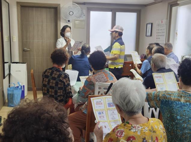 ![]() 경로당에서 방문간호사가 어르신들에게 고혈압과 당뇨병 예방‧관리법을 교육하는 모습 |