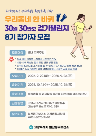 ![]() ‘우리동네 한 바퀴 30일 30만보 걷기챌린지’8기 참가자 모집 안내문 |