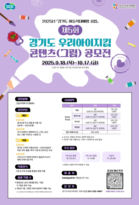 참가 대상은 개인 부문은 경기도 거주 아동(2016~2021년생), 기관 부문은 경기도 소재의 아동(2016~2021년생)이 속해있는 모든 교육, 돌봄, 복지 기관 및 단체이다. 참가신청서, 동의서, 그림 원본 스캔 파일(JPG, JPEG, PNG 중 택1)을 10월 17일까지 전자우편으로 제출하면 된다.