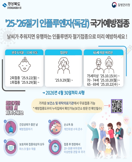 김호섭 경상북도 복지건강국장은 “인플루엔자 예방접종은 입원과 사망 위험을 줄이고 건강한 겨울을 보내기 위한 필수 조치”라며, “지역 주민들께서는 접종 대상에 해당하면 반드시 예방접종을 받으시길 바란다”고 당부했다.