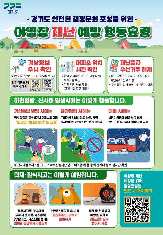 장향정 경기도 관광산업과장은 “이제는 야영장에서도 기상특보 상황에 맞는 행동 기준이 필요하다”며 “관리자와 이용객 모두가 준비된 캠핑을 할 수 있도록 앞으로도 다양한 안전 정책을 이어가겠다”고 말했다.