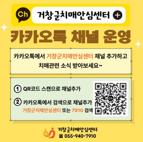 채널 이용방법은 카카오톡 앱에서 ‘거창군치매안심센터’ 또는 대표번호 ‘7910’을 검색하거나 포스터의 QR코드를 스캔해서 추가하면 된다.
