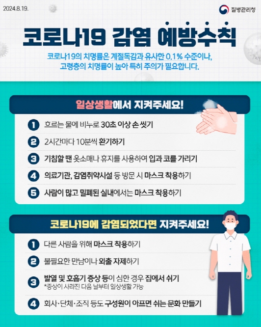 보건소 관계자는 “9월에도 코로나19 확산세가 지속되는 만큼, 국민 여러분께서는 손 씻기, 기침 예절 준수, 주기적 환기 등 호흡기감염병 예방수칙을 생활화해 달라”며 “특히 어르신 등 고위험군은 사람이 많이 모이는 실내 행사 참여를 자제하고, 부득이하게 참여할 경우 반드시 마스크를 착용해 주시길 바란다”고 당부했다.