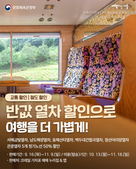 서해금빛열차, 남도해양열차, 동해산타열차, 백두대간협곡열차, 정선아리랑열차 관광열차 5개 정기노선 50% 할인