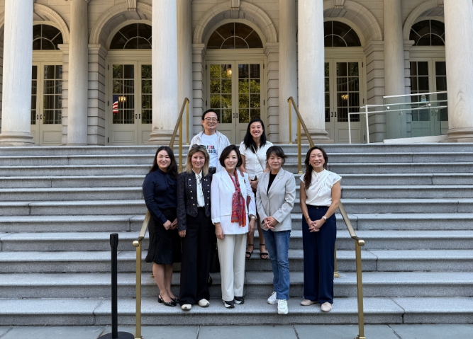 ![]() 뉴욕시청사 앞(왼쪽 위에서부터 김형재 위원, 샌드라 황 의원, 줄리 왕 의원, 아이수루 부위원장, 김경 위원장, 김혜영 위원, 린다 리 의원) |