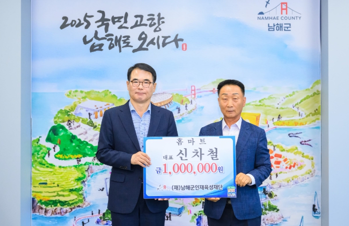 9월 23일 남해읍 홈마트 신차철 대표가 군수실을 방문해 인재육성기금 100만원을 기탁했다.