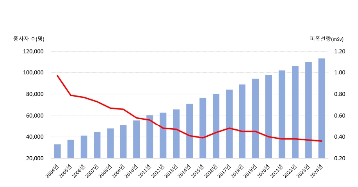 ![]() 방사선관계종사자 및 피폭선량 현황(2004년~2024년) |