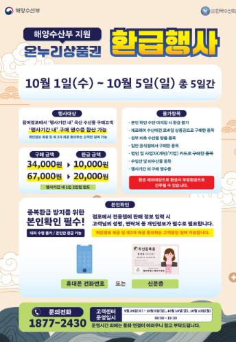 함양군에 배정된 사업비는 4,000만 원이며, 지난 7월 농·축산물 행사와 동일하게 수산물을 3만 4,000원 이상 구매 시에는 온누리상품권 1만 원을, 6만 7,000원 이상 구매 시는 2만 원 까지 환급받을 수 있다.