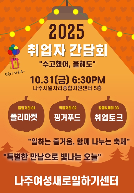 ![]() 나주여성새로일하기센터(센터장 최진아)는 오는 10월 31일 나주시 일자리종합지원센터에서 지역 여성 취업자 50여 명이 참여하는 취업자 간담회를 개최한다. 2025년 나주새일센터 취업자 간담회 포스터. |
