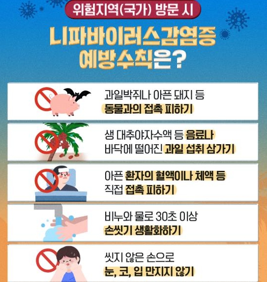 예방을 위해서는▲ 과일박쥐·돼지 등 야생동물 접촉 피하기 ▲ 오염 가능 식품(생 대추야자수액 등) 섭취 삼가 ▲ 손 씻기 등 개인위생 철저 ▲ 감염 의심 환자 접촉 피하기 등의 수칙을 지켜야 한다.