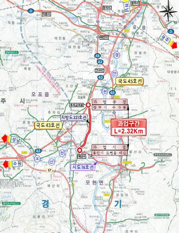 매산~일산간 도로 확포장공사는 용인시 처인구 매산리 매산교차로에서 광주시 추자동 추자회전교차로까지를 연결하는 총 길이 2.3km, 폭 12m(2차로) 도로다. 총사업비 587억 원을 투입해 불량한 도로 평면과 경사도를 개선하고 폭이 좁아 사고위험이 높은 갓길을 확장했다.