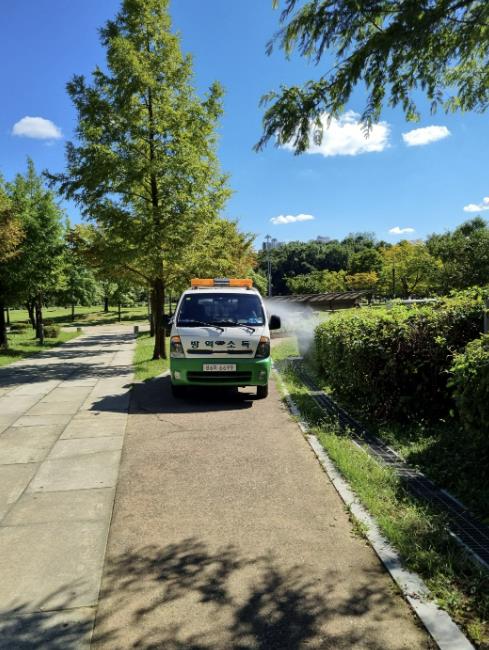 ![]() 수원시보건소가 방역차로 광교호수공원에서 방역을 하고 있다. |