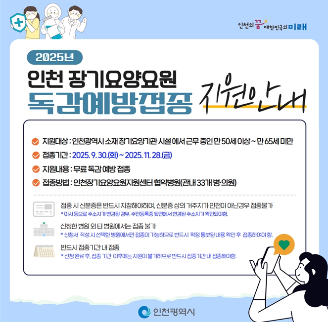 인천시에서는 10개 군·구를 통해 접종대상자 명단을 확정하고, 장기요양요원은 사업 수행기관인 인천장기요양요원지원센터와 사전 협약한 지정병원(33개소)에서 예방접종을 받을 수 있다.