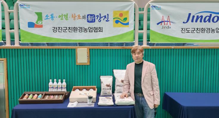 ![]() 강진에서 생산된 유기농 ‘음악 듣고 자란 쌀’과 함꼐 행사에 참여한 김현우 대표 |