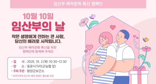 함양군 보건소 관계자는 “이번 캠페인을 통해 임산부가 존중받는 임신·출산·육아 친화적 사회 분위기를 조성하고, 군민 모두가 함께 공감하는 문화를 만들어 나가겠다”라며 “앞으로도 아이 낳고 키우기 좋은 함양을 만들기 위해 최선을 다하겠다”라고 말했다.