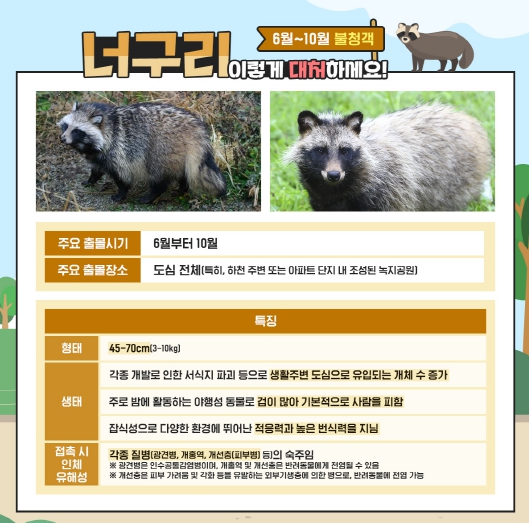 최근 너구리들이 먹이부족 등으로 공원·아파트 단지 등 구민의 생활권역에서 지속적으로 발견되는 만큼 광견병으로 인한 구민 안전위협요소를 차단하고자 지난해보다 미끼예방약 양을 늘려 살포하기로 했다.