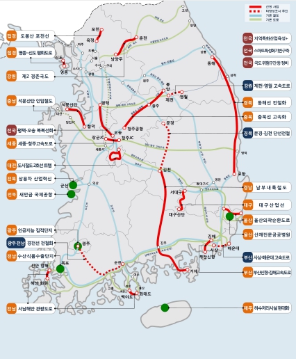 행정절차 중인 사업으로는 ▲새만금국제공항 ▲강원 제2경춘 국도 ▲충남 석문산단 인입철도 ▲세종-청주 고속도로 ▲경남 남부내륙철도 ▲대구산업선 ▲울산외곽순환도로다.