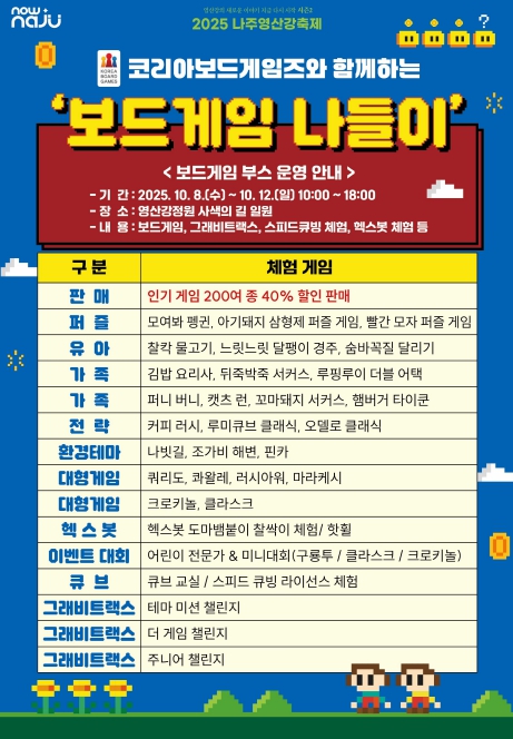 ![]() 나주시가 ‘2025 나주영산강축제’에서 ‘보드게임 나들이’ 프로그램을 운영한다. |