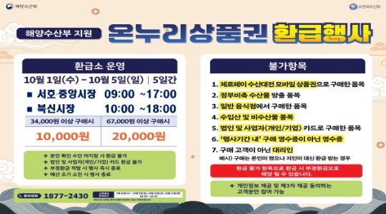 이번 행사는 해양수산부 주관으로 수산물 가격 부담 완화와 소비 촉진 및 전통시장 활성화를 목표로 마련됐다. 행사 기간 동안 참여 점포에서 국내산 수산물을 구매한 소비자가 영수증을 환급소에 제출하면, 구매 금액에 따라 최대 2만원까지 온누리상품권으로 환급받을 수 있다.